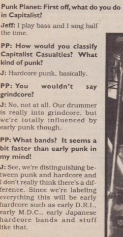 It isn’t hard to see that with modern internet and streaming, subgenres are increasingly being applied to music. These subgenres have been present since before the 90s (country has Hillbilly, Rockabilly, Nashville Sound, etc.) Rock is maybe one of the most prominent “umbrella” genres that includes one of the widest varieties of subgenres. Subgenres are often, but not always, applied to bands in retrospect. There is some separation between when these bands were developing and making their first albums and when fans create a new label to apply to them (for example, Iggy Pop and the Stooges may now be considered proto-punk, but during their early years, punk wasn't quite a genre yet.) While terms themselves are not often debated (that both the terms grunge and post-grunge exist is generally accepted), what bands they apply to and what they sound like are some of the most common and least agreed-upon discussions I have seen in subreddits regarding music. It is harder to tell when this hyper-categorization started, so I began looking through two prominent magazines in the alt-rock scenes of the 90s, SPIN Magazine and Punk Planet, to find mentions of the same subgenres we use today. Looking through a 1995 issue of Punk Planet I saw mentions of hardcore, college-rock, grunge, emo, grindcore, pop punk, and punk. I was surprised to see this amount of genre discussion already present, and it seems like many musicians at the time felt the same. In the same issue, an interview with the bassist/vocalist of the band Capitalist Casualties, displays this discomfort and confusion with the labels (right).